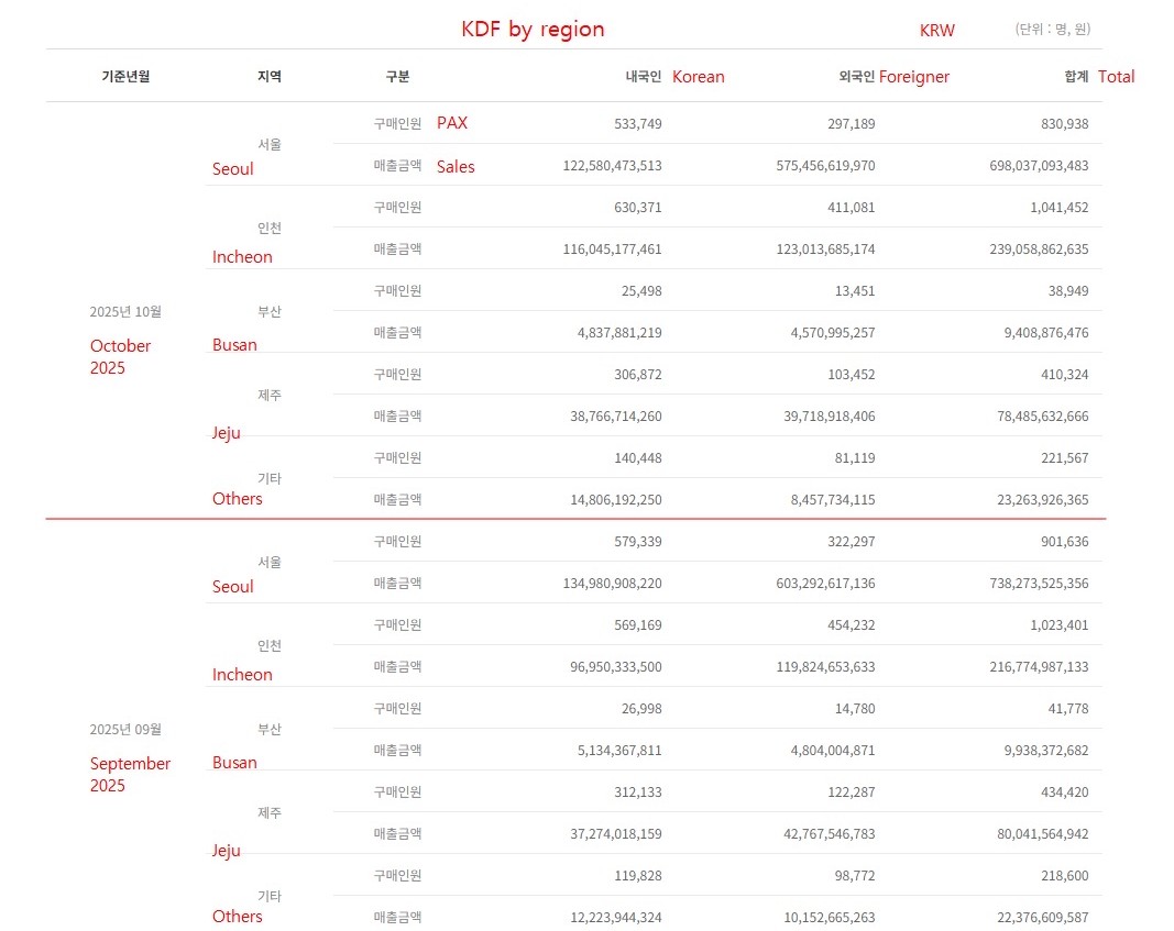 Total sales at Korean downtown duty-free stores (excluding JTO and JDC on Jeju island) declined -12.6% compared with October 2024 and -5.6% month-on-month to KRW742,934,913,193 (US$506.2 million), reflecting the softening Chinese spend. Foreigners accounted for a whopping 82.9% of downtown sales.