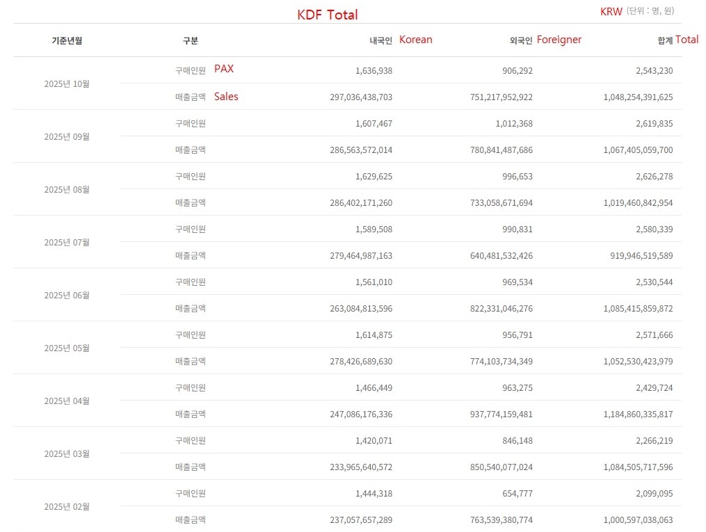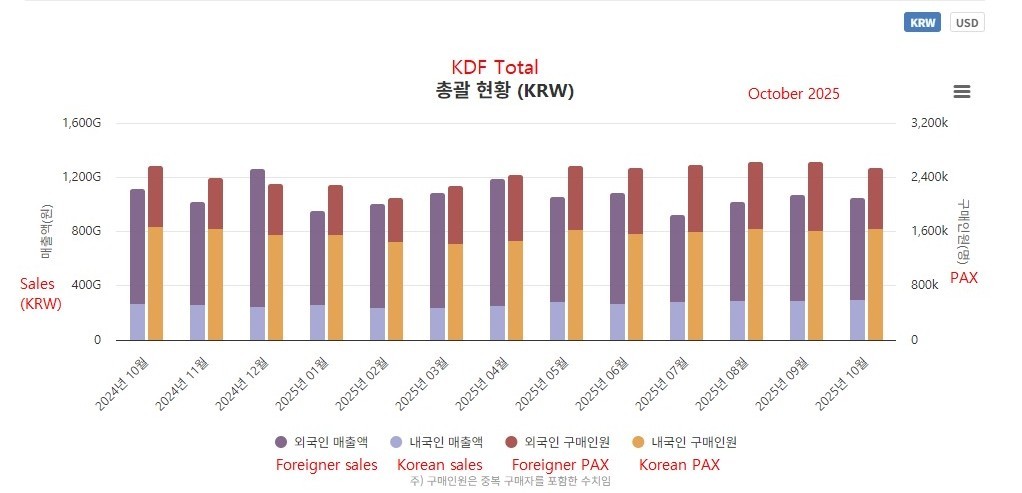SOUTH KOREA. Duty-free sales nationwide (excluding inflight retail) fell -5.7% year-on-year in October and -1.8% month-on-month to KRW1,048,254,391,625 (US$741.3 million), according to newly released Korea Duty Free Association figures.