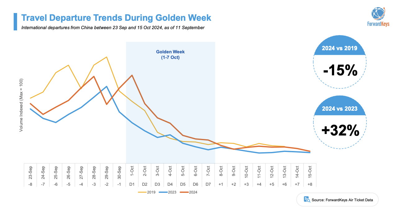 Focusing on Golden Week, outbound bookings were a sharp +32% higher than in 2023, indicating a strong resurgence in travel during the holiday period.