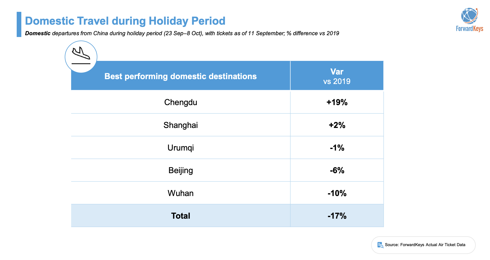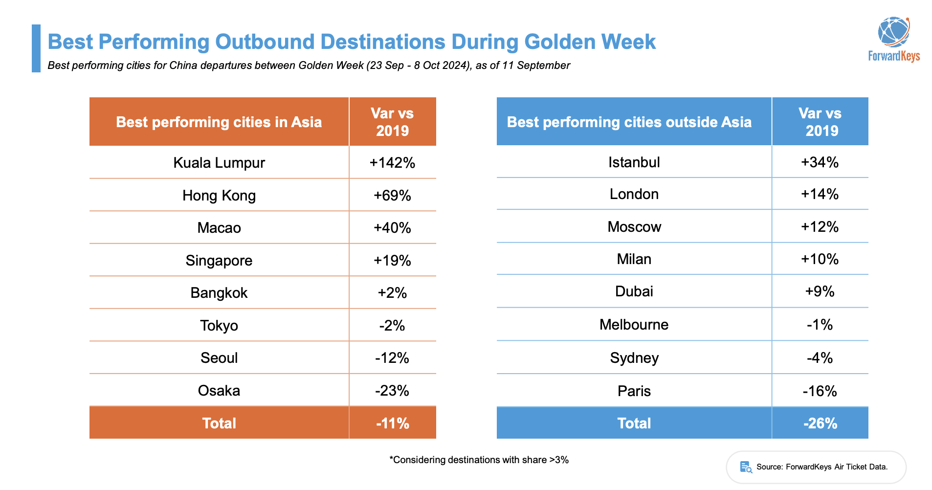 According to ForwardKeys, Asia continues to capture a significant share of Chinese travellers despite an -11% decrease overall on 2019 levels.