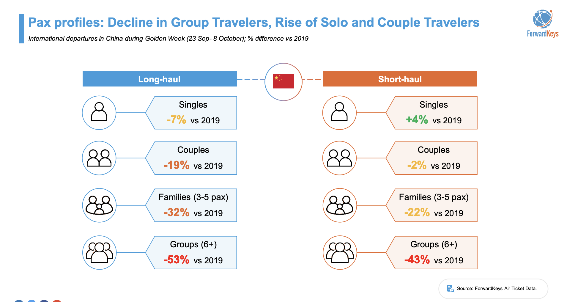 Data suggests group travel is not as popular during Golden Week as it used to be, for both for long-haul and short-haul trips. There has been a -53% reduction in group travellers for long-haul journeys and a -43% decrease for short-haul trips compared to 2019.