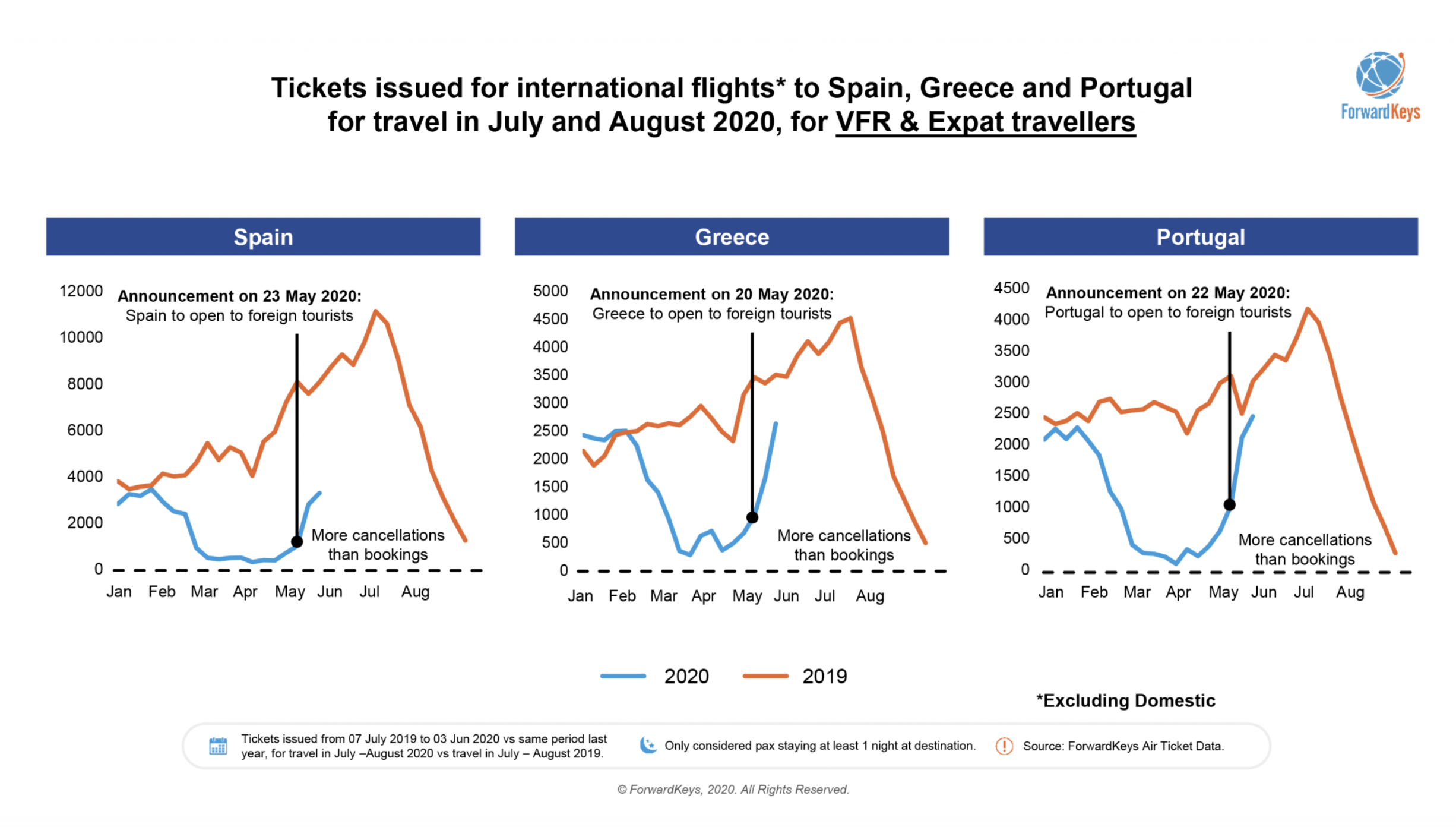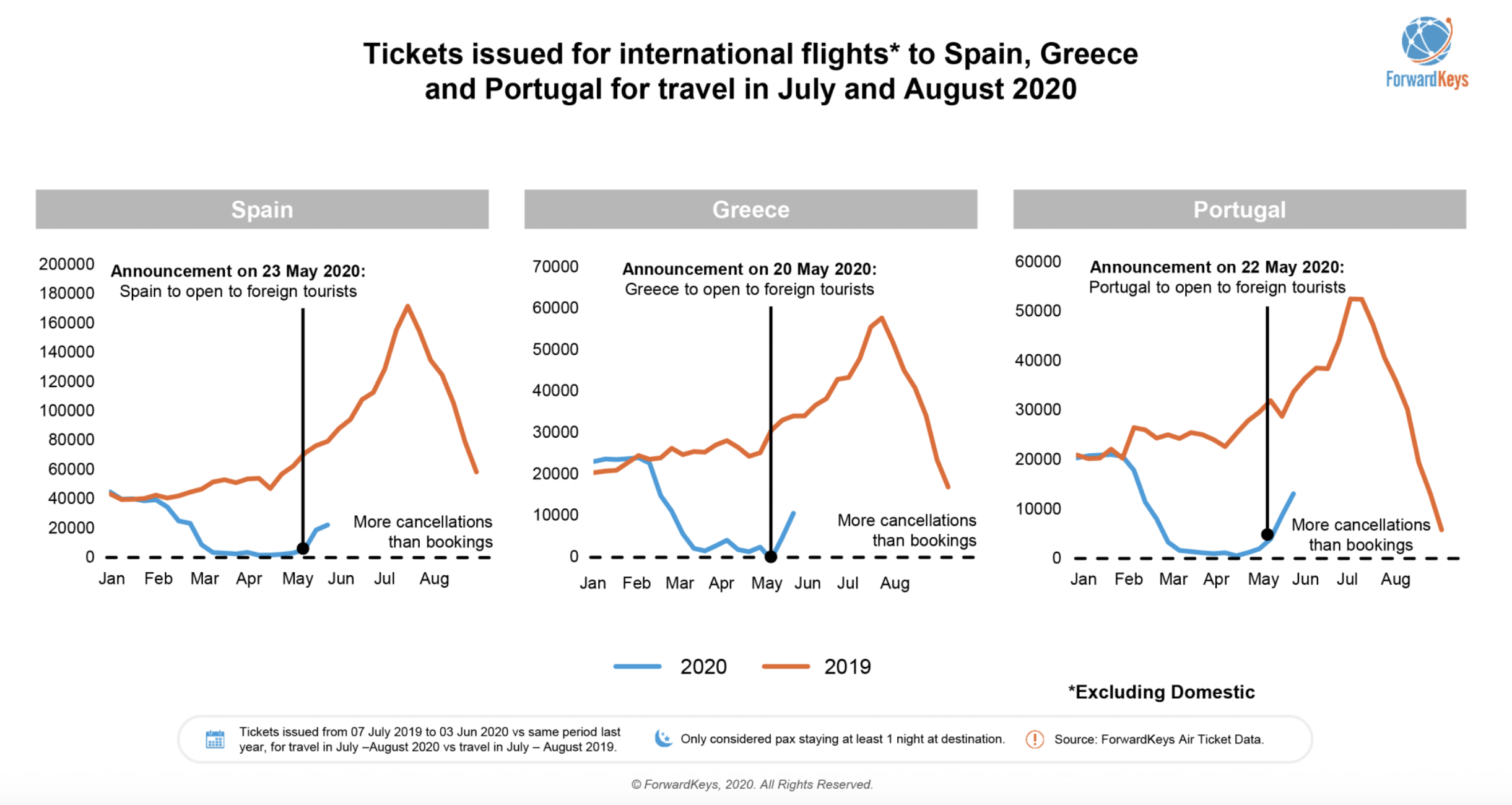 “Bookings for Greece, Portugal, and Spain are respectively 49.8%, 52% and 53.5% behind where they were at the beginning of June 2019. It will still be challenging for any of those countries to rescue this Summer holiday season at this rate.”