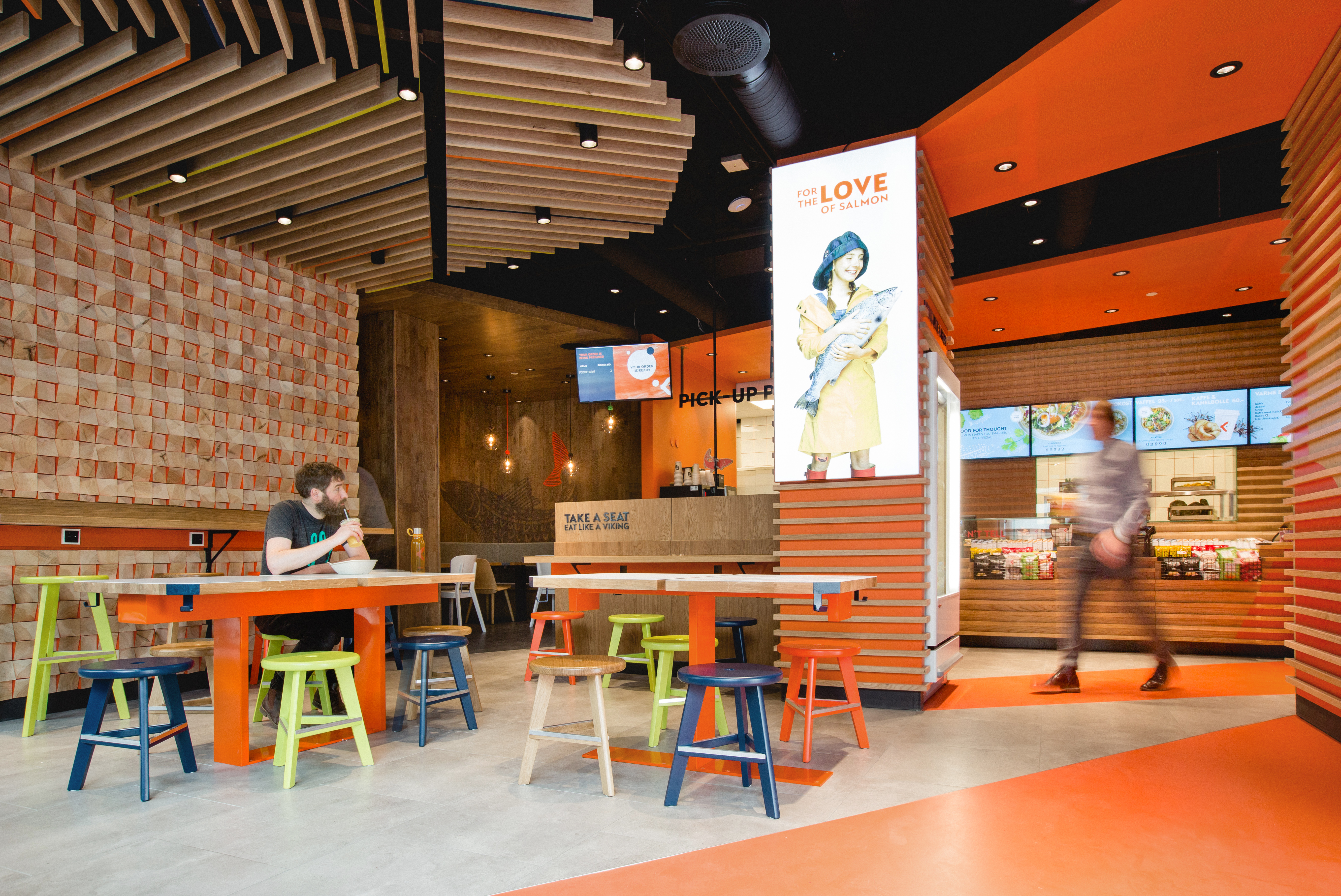 “Pink Fish, designed by Portland Design in London, was ‘travelised’ from the start, and airports are ideal locations alongside busy high streets and shopping malls,” Gjøse continued. “We’ve included thoughtful details like hooks on our tables, special designed tables, our own soundscape and power outlets on every table to allow customers to charge their devices while eating a quick, tasteful and nourishing meal.