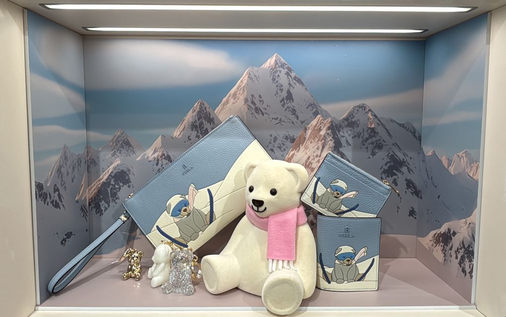 Designed to welcome international travellers during the Olympics, the installations showcase Furla’s bear motif across winter landscapes, while highlighting the brand’s small leathergoods and seasonal window bears.