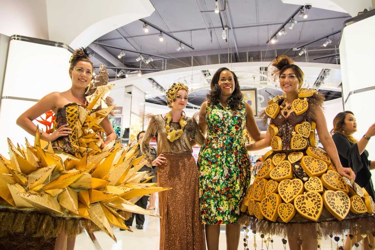 A model in a photo booth wore the Empress Dress, featuring Gold Discovery boxes and garlands of chocolates. She encouraged shoppers to pose for photos wearing the dress after purchasing a box of Gold Discovery.