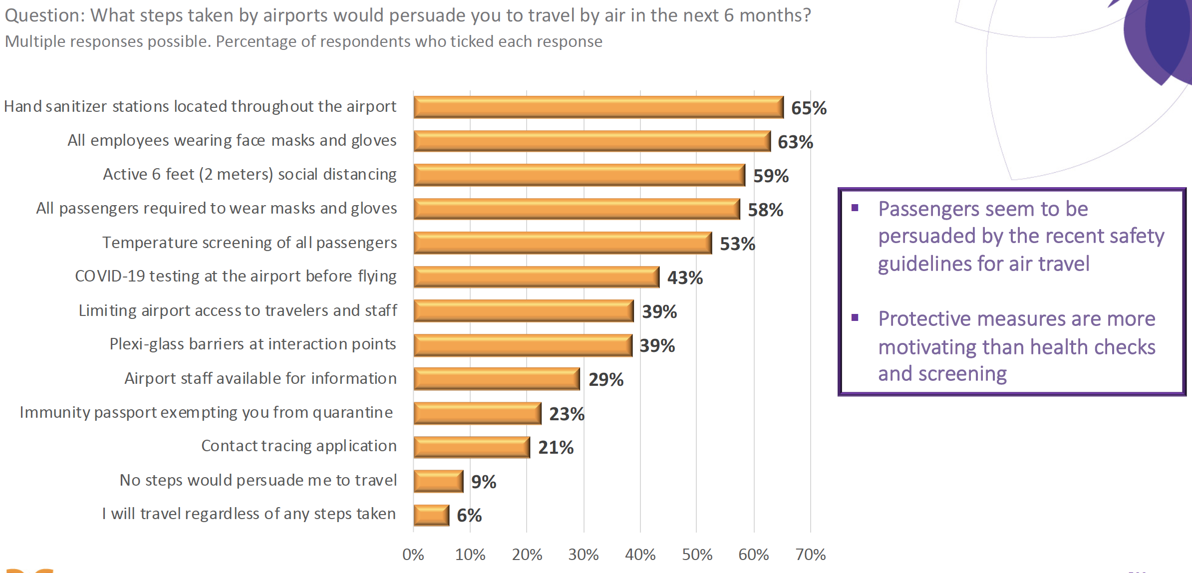 KPI North America has found 65% of respondents would be more willing to travel by air in the next six months if hand sanitiser stations were introduced throughout the airport. Passengers also said they would want to see employees and passengers wearing face masks and active social distancing in force.