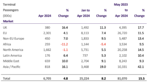 UK. London Heathrow Airport served 6.7 million passengers in April, bringing the total above 25 million for the year to date. The airport said the result keeps it on track for a record-breaking passenger year.