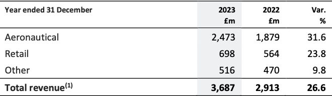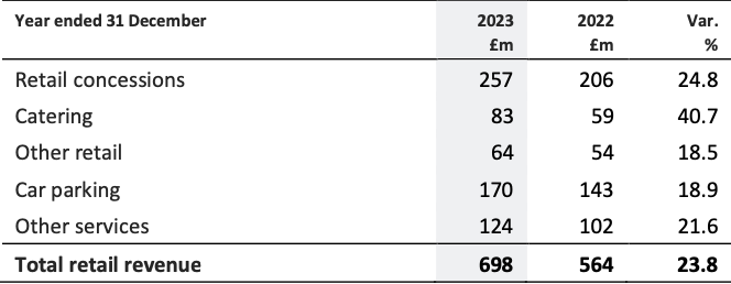 UK. London Heathrow Airport retail revenue increased by +23.8% to £698 million (US$881 million) in 2023, with the rise attributed to higher numbers of departing passengers, car parking revenue, terminal drop-off income, premium passenger services and the mix of retail services available.