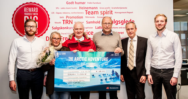 Arctic adventurers: Husky Expedition Spitzbergen 2015 team members (l-r) Morten Klauer, Regina Elpers, Björn Klauer and Håvard Ersland with Gebr Heinemann Executive Director Purchasing and Logistics Kay Spanger (third from left) and Travel Retail Norway Managing Director Håkon Fjeld-Hansen (second from right) |