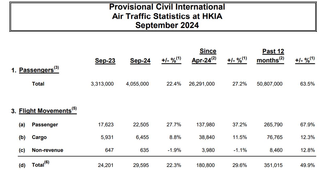 According to the latest data by Airport Authority Hong Kong (AAHK), flight movements at the airport stood at 29,595, up +22.3% from the same month of the previous year.