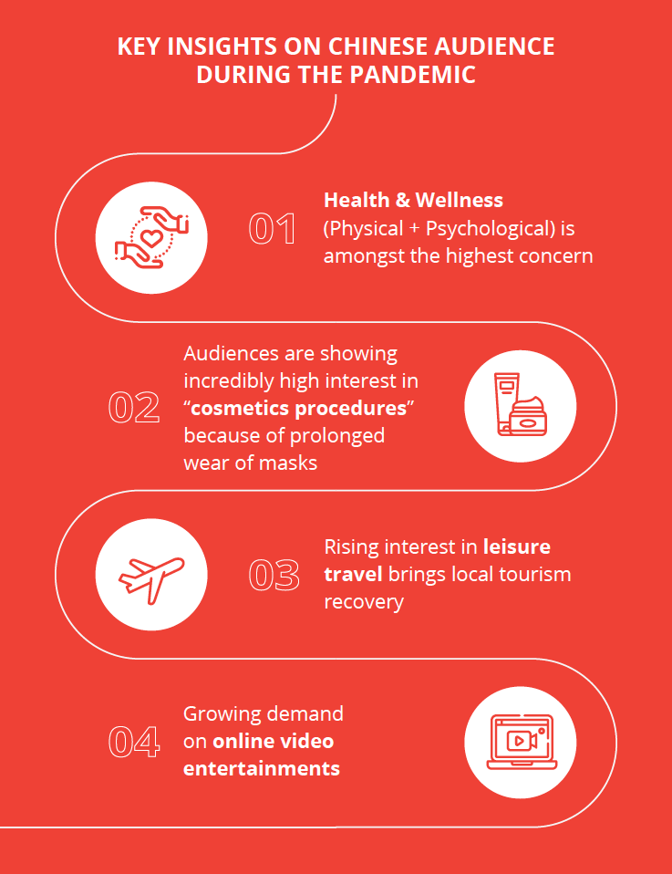 Using a scale of over 16 million Chinese internet users, key insights arising from iAudience’s review of native audiences during the pandemic include health and wellness becoming among the highest concerns; “incredibly” high interest in cosmetics procedures because of prolonged wearing of masks; rising interest in domestic leisure travel; and growing demand for online video entertainment.