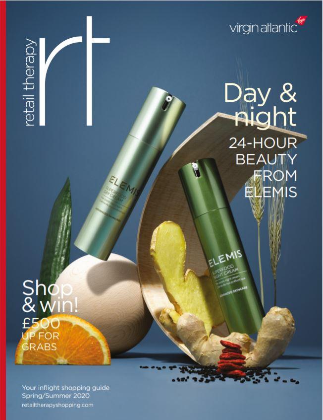 From inflight concessionaire 3Sixty Duty Free & More comes this vibrant image of the spring/summer Virgin Atlantic brochure featuring Elemis Superfood Day Cream and the Superfood Night Cream on the front cover (available via preorder only for now).