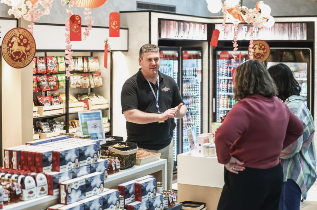 Inspired by a mountain cabin, the shopping journey begins in a bedroom-inspired zone offering gifts and wellness products before continuing through a living room-style area featuring souvenirs and electronics. A kitchen-themed space offers gourmet grab-and-go snacks and beverages.
