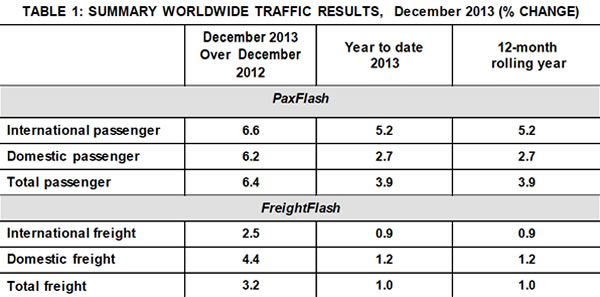 ACI World’s Economics Director Rafael Echevarne commented: “As we end the year with a strong December, it is important to highlight the resilience of global passenger traffic in 2013. While there were fears that growth would become more subdued, preliminary figures still point to year-over-year growth in passenger traffic that is in the vicinity of +3.5% to +4.0%, which is formidable considering the economic environment.