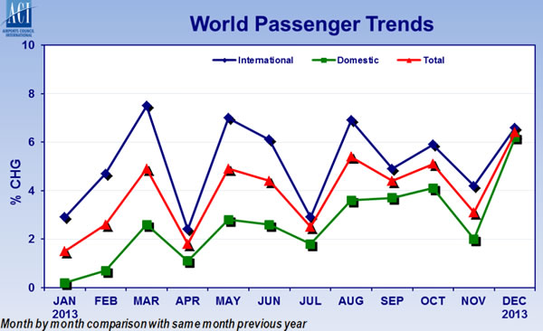 INTERNATIONAL. International passenger traffic at the world’s airports climbed by +5.2% year-on-year in 2013, ACI has reported. Total traffic was up by +3.9% and domestic traffic by +2.7%.