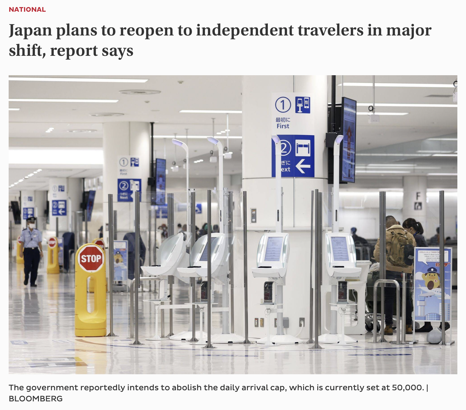 JAPAN. The Japanese government is planning to allow independent tourists to enter the country and exempt them from visas if they have been vaccinated three times or submit a pre-arrival test result. That’s according to a Fuji TV report, quoted by The Japan Times. The television report noted that the country also intends to abolish the daily foreign arrivals cap, which was recently raised to 50,000.