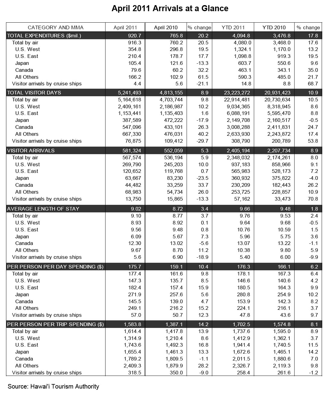Total spending by Japanese visitors for the first four months of 2011 was US$603.7 million, an increase of +9.6% compared to the same period last year. Japanese arrivals declined -4.0% over the four months. However, average daily spending was higher at US$281 per person compared to US$255 per person in the first four months of 2010.