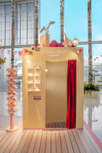 It is dressed in a pastel colour palette and features retro seaside-inspired décor complete with Raspberry Ripple ice cream sculptures, striped awnings, playful seagulls and a Bedford-style ice cream van.