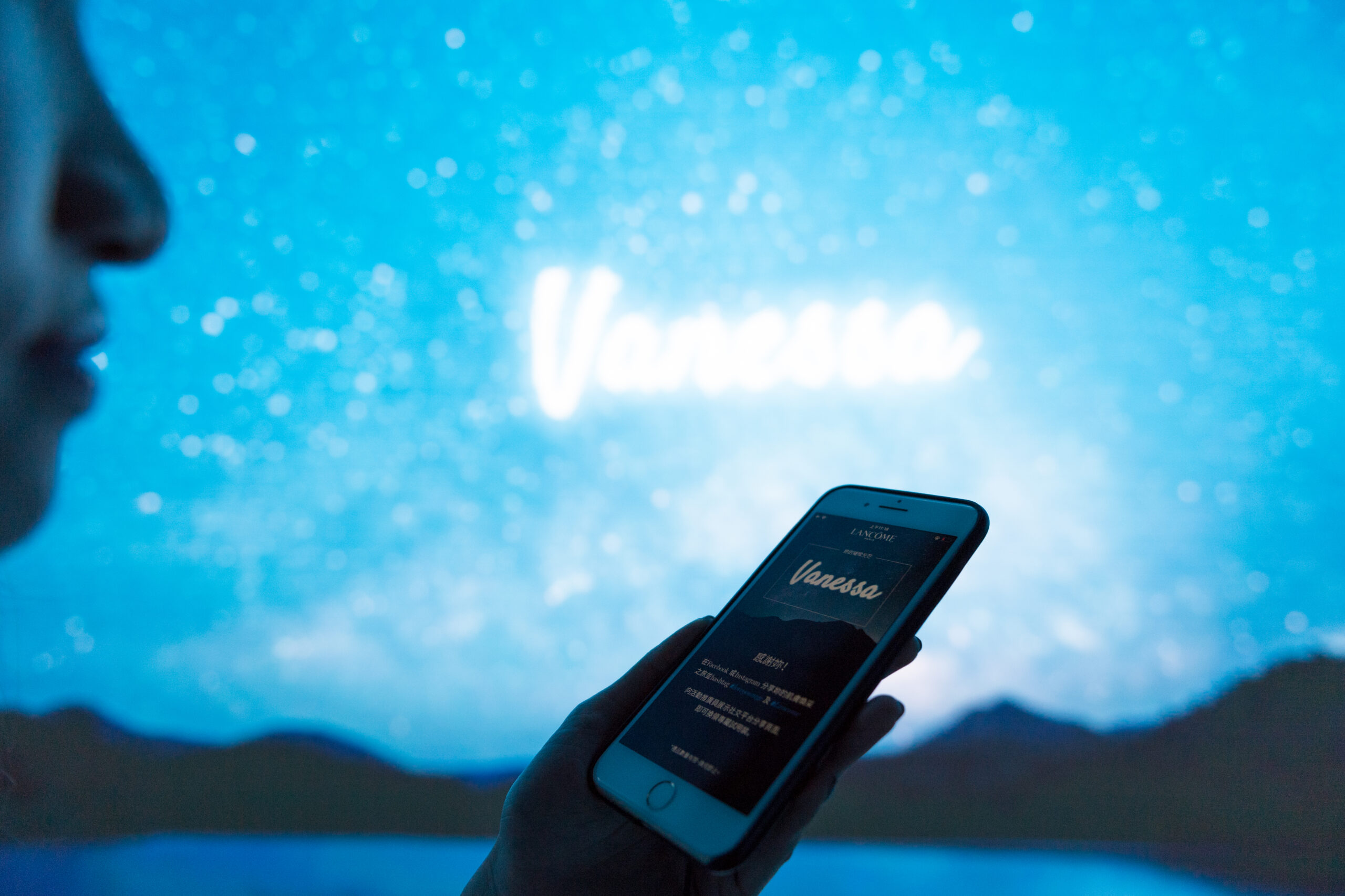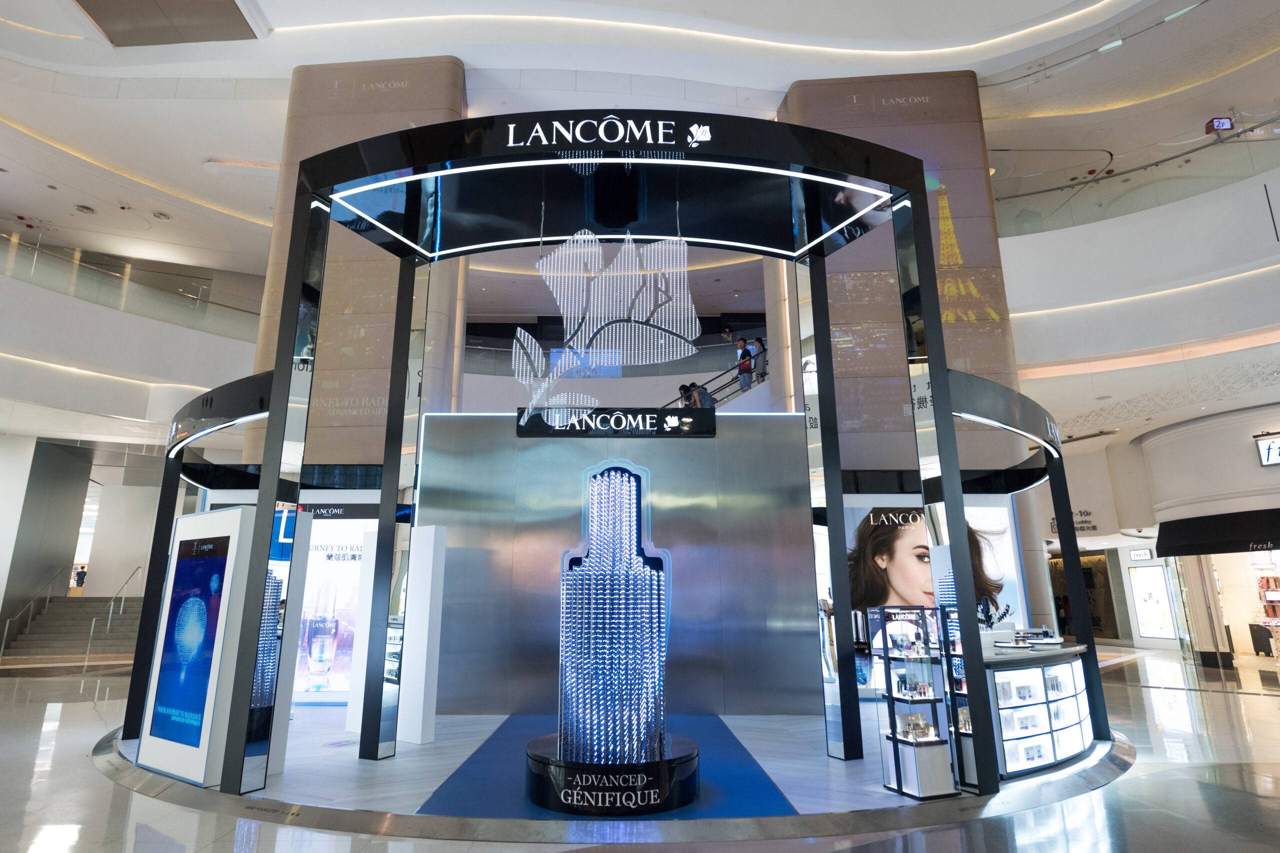The concept and experience in the first pop-up was designed to send shoppers on a virtual journey with Advanced Génifique. The first touch point was a 2m tall replica of the Advanced Génifique serum bottle, constructed from 16,800 LED bulbs illuminating a gradient in unison. Consumers could also interact with an augmented reality photo booth, capturing images and GIFs to share on social media. With gesture detection sensors, various Lancôme icons appeared in their hands.