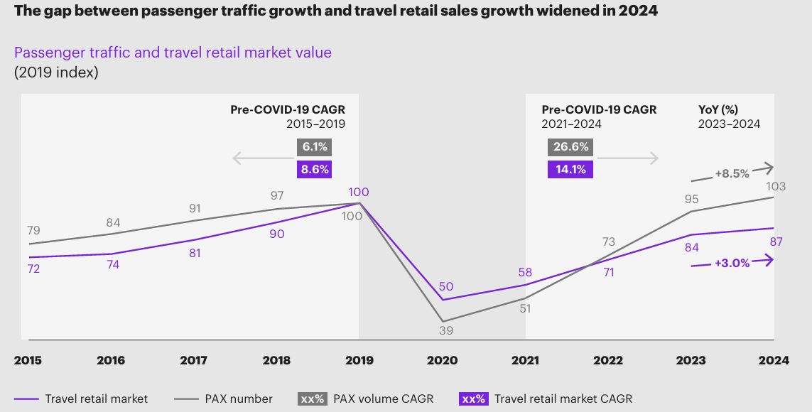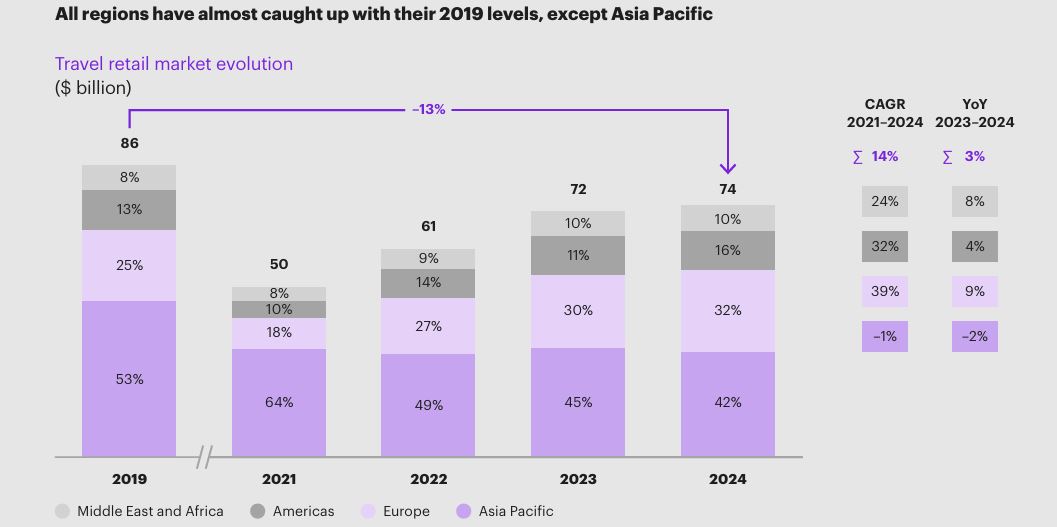 Despite the ongoing rebound in air travel, travel retail sales remain behind, reaching US$74.1 billion in 2024 – 13% below pre-pandemic 2019 levels, even with record passenger traffic.