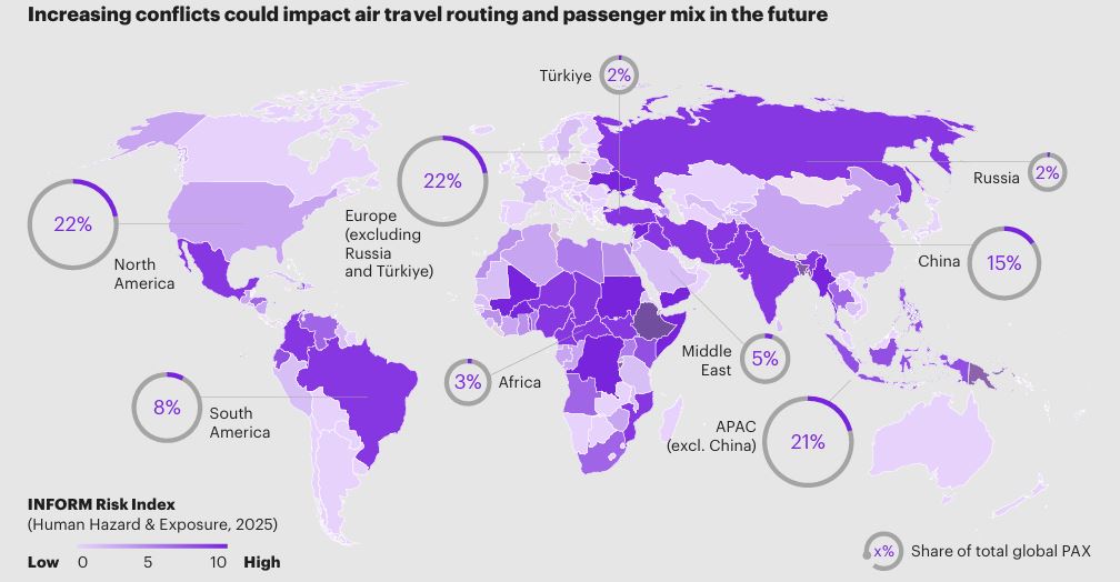These macro forces have tangible effects on passenger sentiment, behaviour and operational strategy. Key travel retail locations face significant disruption risk, with 40% of passengers passing through high-risk Middle East countries and 30% through APAC, meaning roughly US$18 billion – or a quarter of the global market – is in volatile regions.