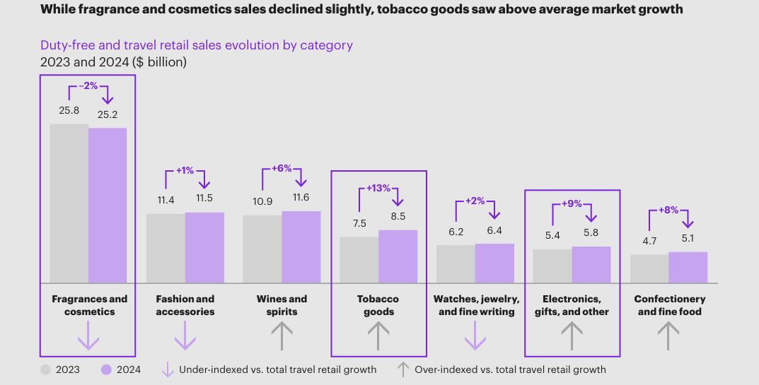 Globally, performance varied by category, with fragrance and cosmetics accounting for one-third of total sales, tobacco rising +13%, and confectionery, fine foods and electronics all increasing, even amid ongoing tariff concerns.