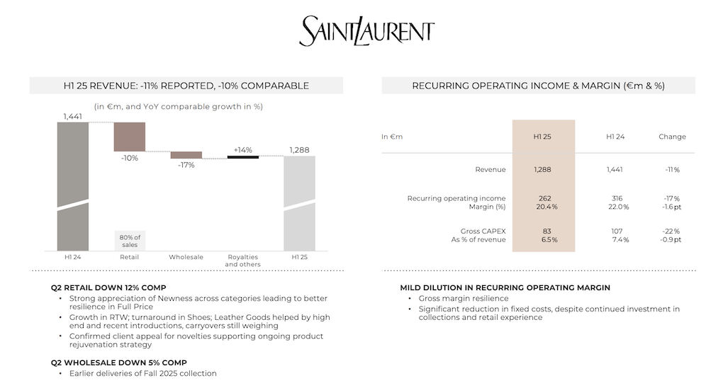 Yves Saint Laurent posted H1 revenue of €1.3 billion, down -11% as reported and -10% on a comparable basis. Direct retail sales fell -10%, while wholesale revenue declined -17%. The brand noted positive reception for new ready-to-wear and footwear ranges.