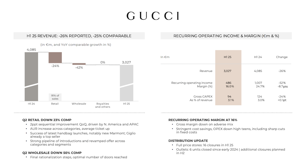 Kering reported recurring operating income of €969 million for the first half of 2025, representing a -39% year-on-year decrease.
