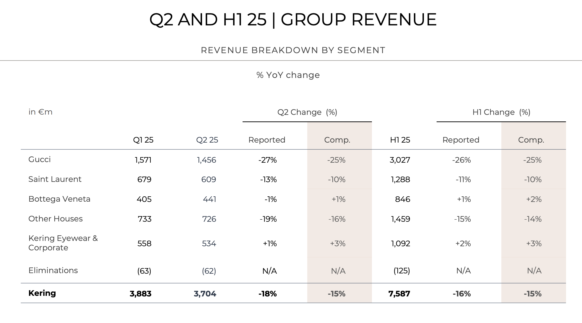 Luxury group Kering has posted a -16% decline in reported revenues (-15% comparable) for the first half ended 30 June, reflecting continued headwinds across its luxury brand portfolio.