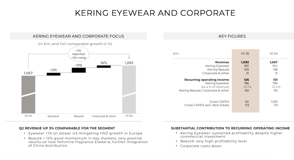Kering Eyewear and Corporate posted revenue of €1.1 billion in H1 2025, up +2% as reported and +3% on a comparable basis. Kering Eyewear accounted for €921 million of this total, up +1% as reported and +2% on a comparable basis. Recurring operating income for Eyewear was €126 million, compared to €196 million in H1 2024.