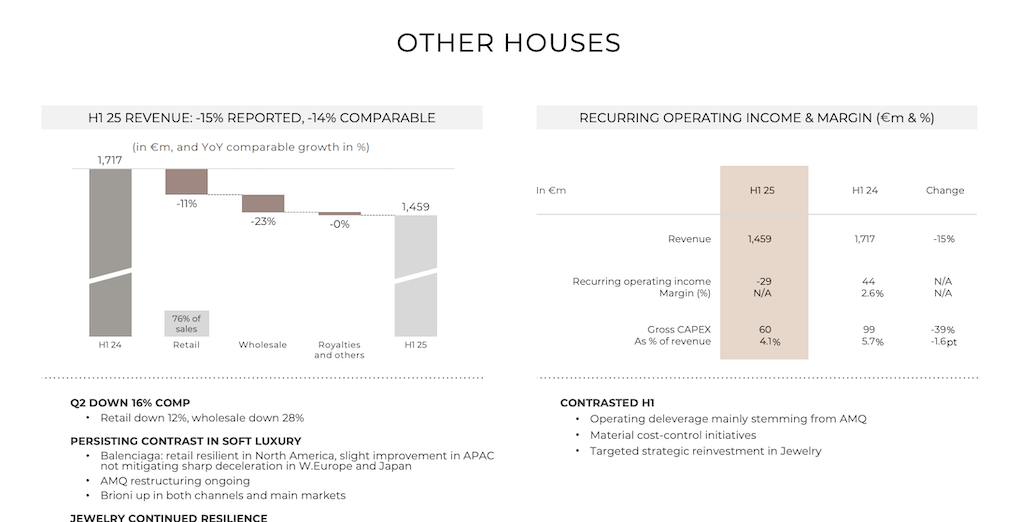 Bottega Veneta delivered a more resilient performance with revenue of €846 million, up +1% as reported and +2% on a comparable basis. Retail sales rose +3%, offsetting a -3% decline in wholesale. Second-quarter retail sales were flat overall but saw growth in North America.