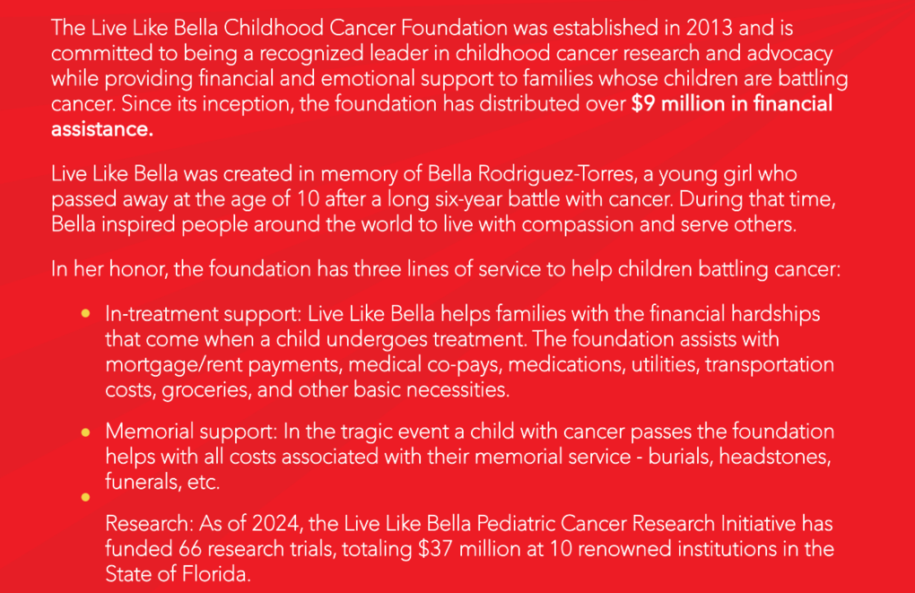 “We have chosen to support LIVE LIKE BELLA Childhood Cancer Foundation, which was created in 2013 in memory of Bella Rodriguez‑Torres, a young girl who passed away at the age of ten after a six‑year battle with cancer.