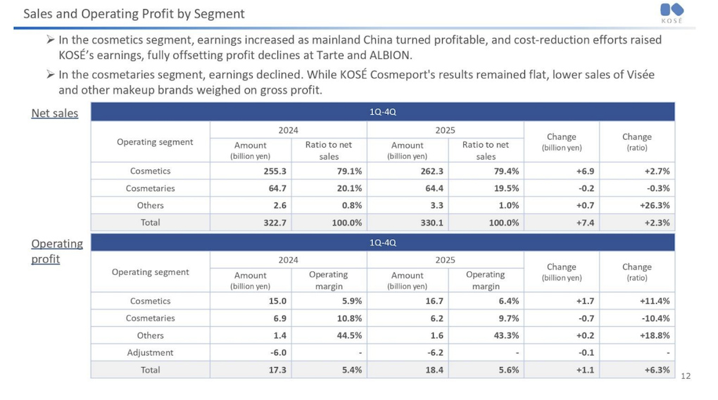 Operating profit rose +6.3% to ¥18.4 billion (US$118.7 million), supported by improved profitability in the core KOSÉ business despite profit declines at Tarte and ALBION.