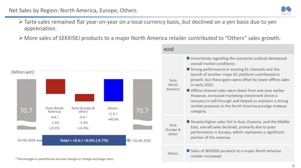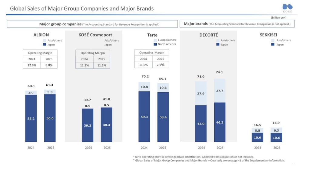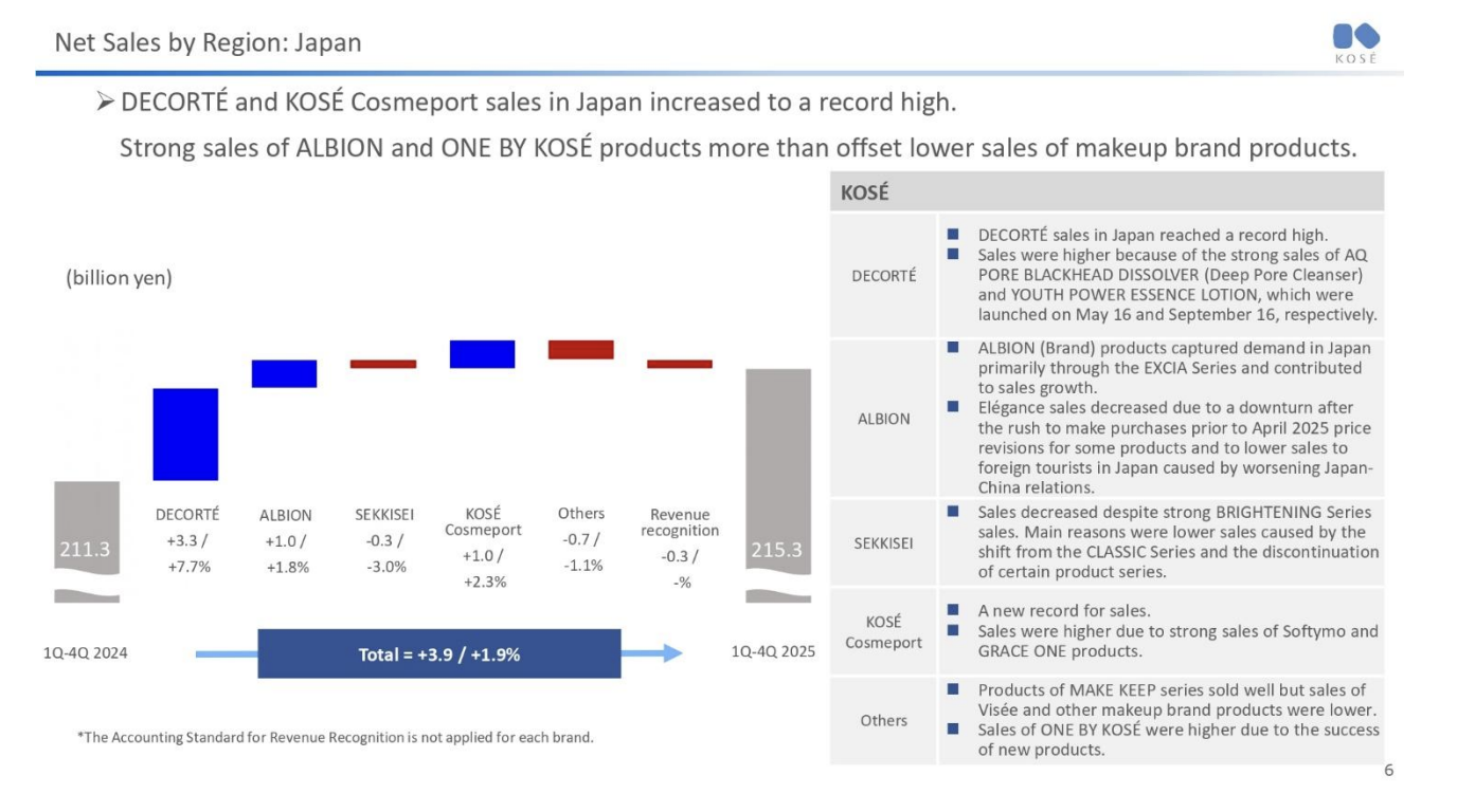 Japan remained the largest contributor, with sales rising +1.9% to ¥215.3 billion (US$1.4 billion). Growth was driven by record sales from DECORTÉ and KOSÉ Cosmeport, supported by strong performance from ALBION and ONE BY KOSÉ.