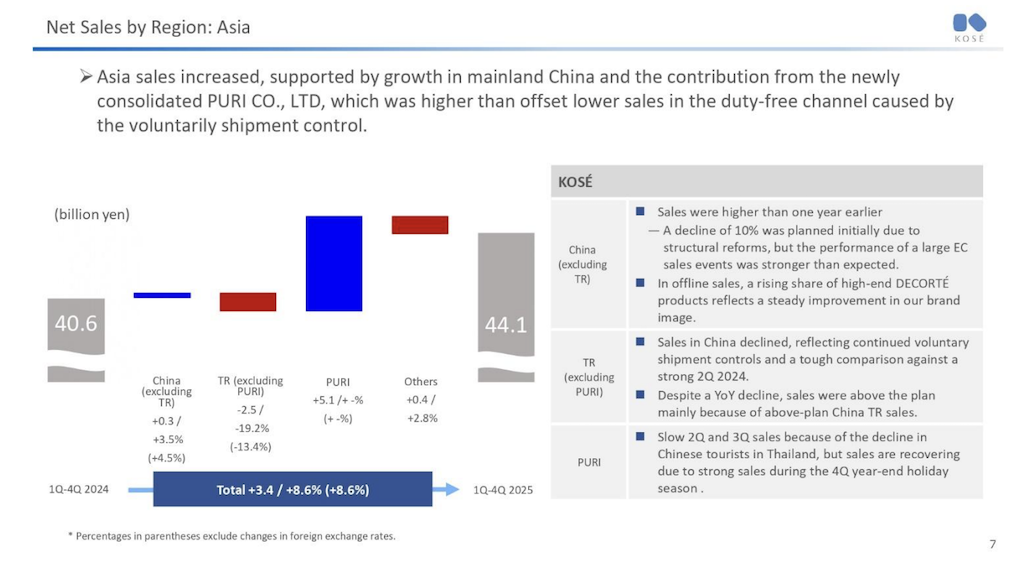 Domestic Mainland China and wider Asia gains offset the decline alongside strong performances from the core KOSÉ, ALBION and KOSÉ Cosmeport businesses and the newly consolidated PURI Co.