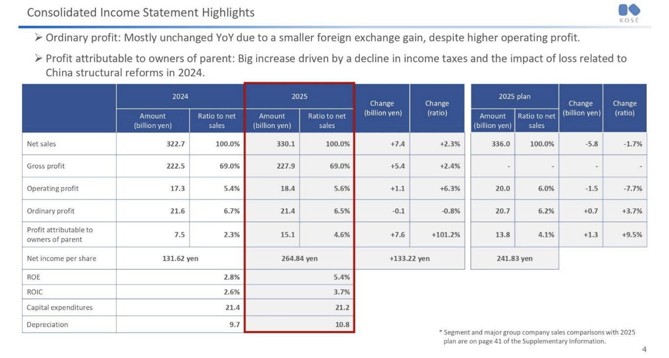 Overall, KOSÉ Holdings Corporation delivered +2.3% (+2.6% excluding foreign exchange) year-on-year net sales growth to ¥330.1 billion (US$2.13 billion).