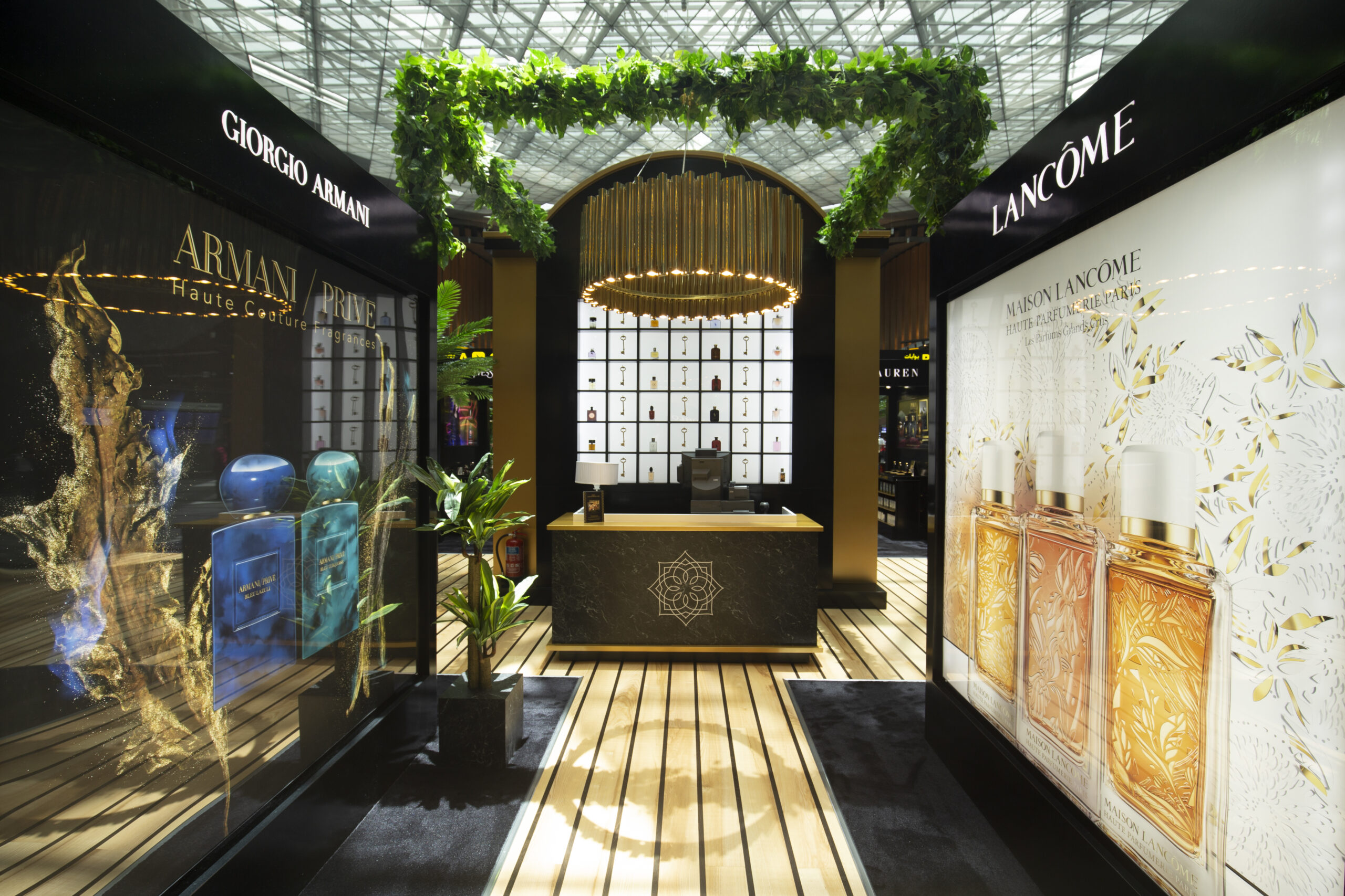 Launched at the end of July, the installation welcomes customers at a “concierge desk” where they are offered fresh drinks. They are then invited to explore the podium, which offers fragrances from five of the group’s leading brands: Lancôme; Yves Saint Laurent; Giorgio Armani/Privé Haute Couture Fragrances; Ralph Lauren; and Maison Margiela.