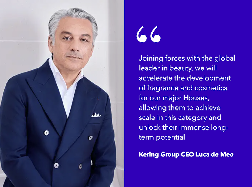 Kering CEO Luca de Meo said: “This strategic alliance marks a decisive step for Kering. Joining forces with the global leader in beauty, we will accelerate the development of fragrance and cosmetics for our major Houses, allowing them to achieve scale in this category and unlock their immense long-term potential, as did Yves Saint Laurent Beauté under L’Oréal’s stewardship.