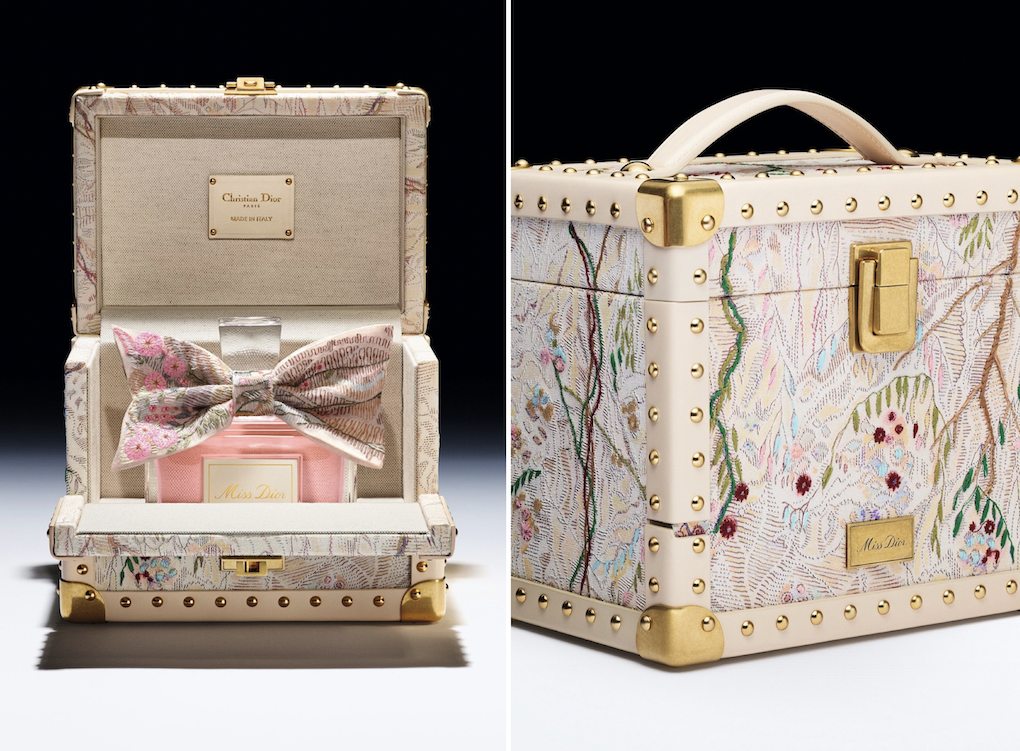 In addition, Dior has partnered with French artist Eva Jospin to create a colourful hand-embroidered motif for a special Miss Dior trunk. The motif is entirely hand-embroidered by Ateliers Chanakya in India, and houses a glass bottle of Miss Dior adorned with a houndstooth pattern and dagger bow.