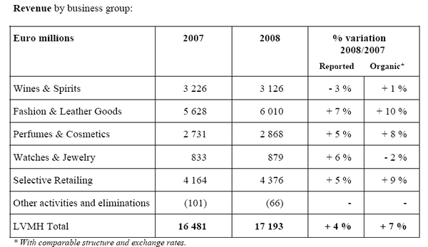 LVMH Chairman and CEO Bernard Arnault said: “The 2008 results demonstrate the exceptional reactivity of our organisation in this period of economic crisis. The Group has always emerged stronger from previous economic downturns thanks to the dynamic innovation of its brands, the quality of its products and the effectiveness of its teams. LVMH approaches the challenges and the opportunities of 2009 with confidence and determination and has set the objective of increasing its leadership position in the worldwide luxury goods sector.”