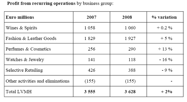 As a group, LVMH revenues hit €17.2 billion in the year, up by +4% Profit from recurring operations rose by +2% to €3,628 million while group share of net profit was stable compared to 2007 and came to €2,026 million. In the fourth quarter, reported revenue was €5.2 billion, an increase of +4%.