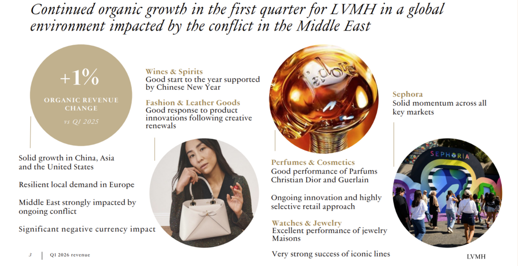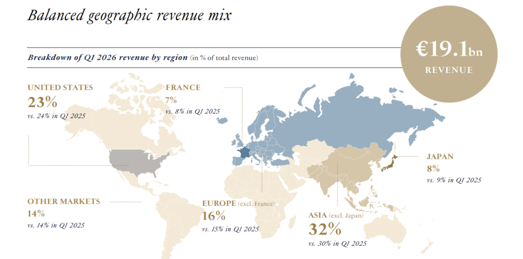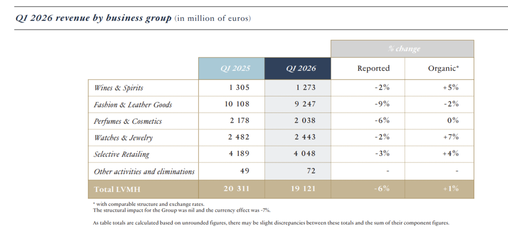 Luxury and premium brands powerhouse LVMH Moët Hennessy Louis Vuitton posted a -6.0% year-on-year fall in reported revenue (+1% organic) to €19.1 billion for the first quarter of 2026.