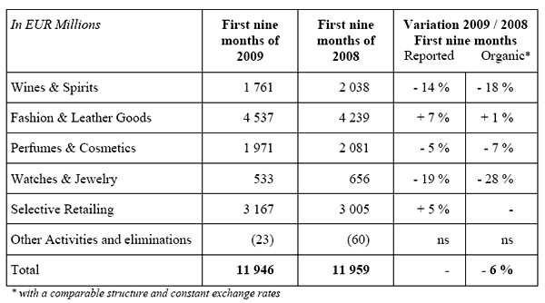 “The revenue reduction of only -3% in the third quarter of 2009, at constant scope and exchange rates, is attributable essentially to the continued de-stocking by distributors for our businesses that do not sell directly to their final customer. The third quarter reflects an improvement from the trends seen earlier in the year, implying that the end of this phenomenon may be approaching. In the third quarter, all business groups recorded better performances than in the first half. This was notably the case for Wines & Spirits and Watches & Jewelry.”
