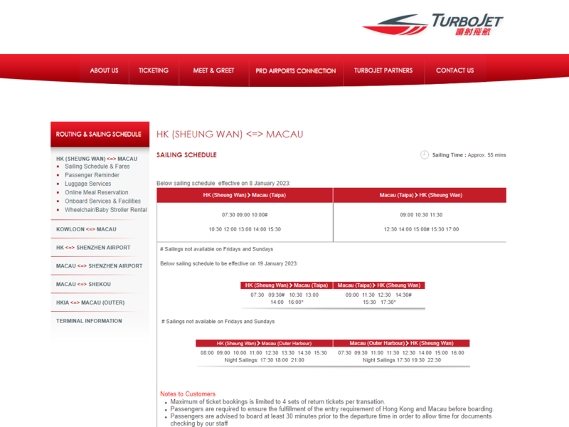 On its website, ferry operator TurboJet posted its service schedules (below) from Macau Outer Harbor Ferry Terminal to Sheung Wan. Two night schedules are included. ✈
