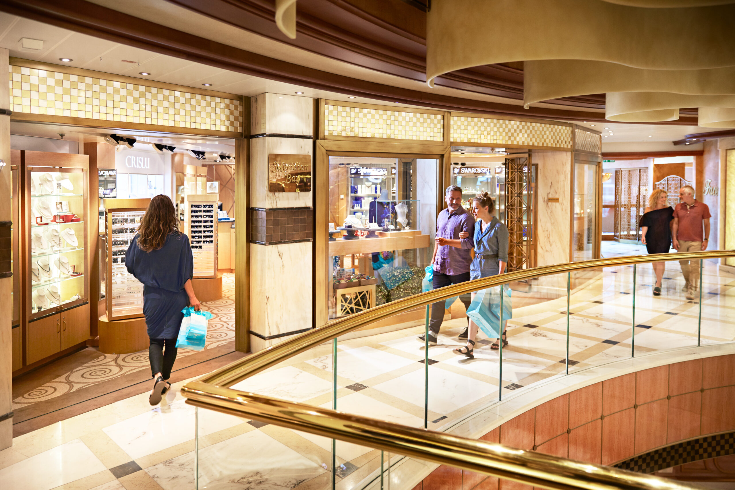 Facets showcases EFFY Diamonds, fine jewellery and designer watches; Meridian Bay sells fashion accessories, costume jewellery, handbags, men’s accessories and cruise wear; Calypso Cove features souvenirs, alcohol, tobacco, sunglasses, and Princess-logoed items; and Celebrations (Royal & Regal) has a chocolate/confectionery selection.