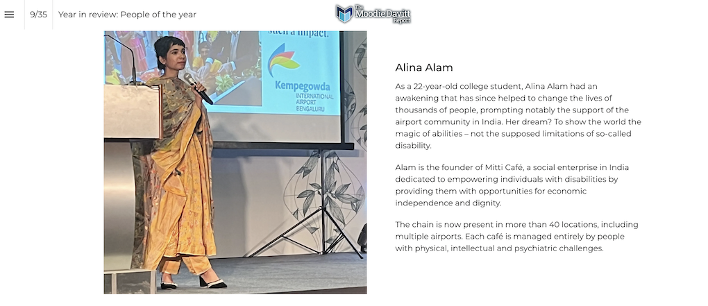 Empowering Abilities: How Alina Alam and Bangalore Airport began an inspiring journey with Mitti Café“This award recognises a remarkable concept. It relates to a chain of cafés that are completely managed by adults with physical, intellectual and psychiatric challenges, a chain now present in more than 40 locations across a nation, including several airports. “Mitti Café in India is a social enterprise dedicated to empowering individuals with disabilities by providing them with opportunities for economic independence and dignity. “Founder and CEO Alina Alam started Mitti Café at just 23 with a powerful dream: to show the world the magic of abilities, not the supposed limitations of so-called disability. I saw her speak during a workshop a few weeks ago in Bengaluru and like everyone in the room was deeply moved by this slip of a woman’s guts, courage, compassion and unwavering determination to make a difference. ![]() “The work done by Mitti Café extends beyond serving food; it creates a platform for skill development, employment and social integration. “But such ventures need support, believers, champions. And in the far-sighted management of Bangalore International Airport Limited, Alina and Mitti Café found exactly that. “For their inspirational and pioneering collaboration in opening the first airport Mitti Café at Kempegowda International Airport Bengaluru – one that subsequently led to other airport openings – and thus enriching the lives not only of those who work there but those who are served there, we jointly make this award to Mitti Café Founder & CEO Alina Alam and Bangalore International Airport Limited.” – The Moodie Davitt Report Founder & Chairman Martin Moodie, speaking at the 2024 Airport Food & Beverage (FAB) + Hospitality Awards in Ontario, California in June 2024 and presenting the 2024 FAB Humanitarian Award to Mitti Café Founder and CEO Alina Alam and Bangalore International Airport Limited Click here for the full Mitti Café story. |