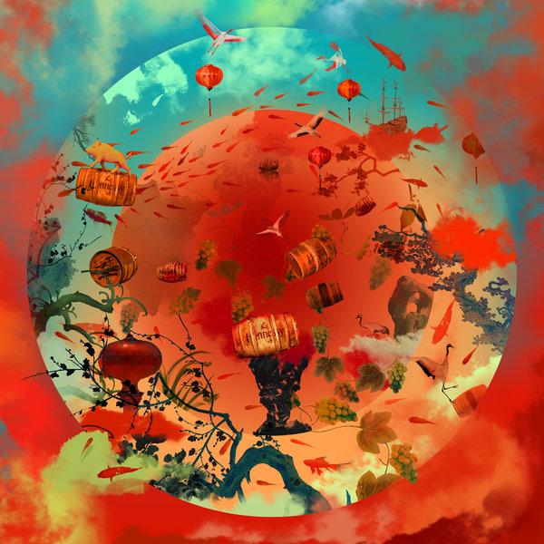 The Cognac house is further depicted by handcrafted oak barrels, grapes and a copper pot still; these are complemented by auspicious motifs such as the crane, goldfish and red lantern.