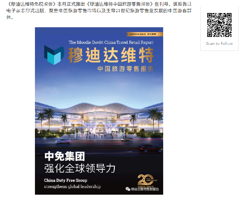 《穆迪达维特免税报告》是唯一进驻微信平台的国际旅游零售行业媒体。《穆迪达维特免税报告》微信公众号现有2,895名关注者,在现有英文平台日渐壮大的中文读者群体基础上实现更广泛触达。如需咨询英文原稿,请联系出版负责人Irene Revilla(邮箱:Irene@MoodieDavittReport.com