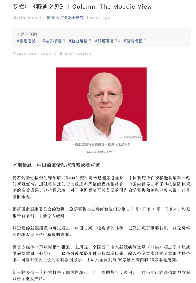 He says “China’s strategy in curbing the latest COVID-19 outbreak, spurred by the highly infectious Delta variant, shows the world what can be achieved via a combination of strong and swift action. It also augurs well for the country’s vital domestic travel retail and duty free business.