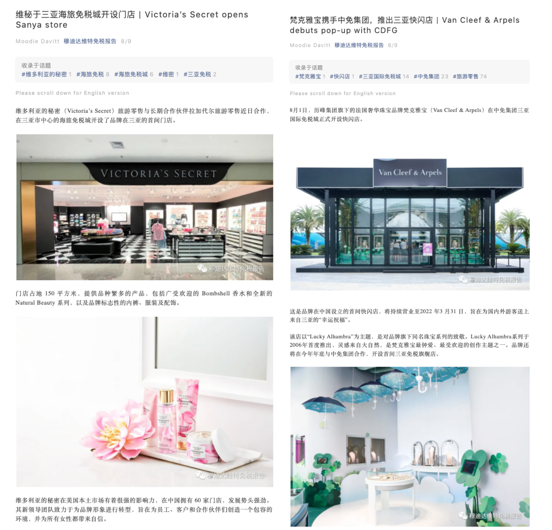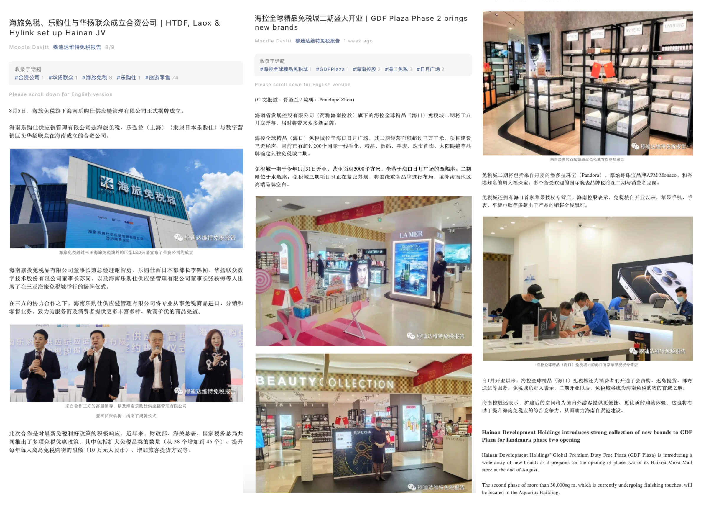 The WeChat report also recapped some of the biggest new openings and activations in Hainan Duty Free. Hainan Development Holdings’ Global Premium Duty Free Plaza (GDF Plaza) is introducing a wide array of new brands as it prepared for the opening of phase two of its Haikou Mova Mall store at the end of August (see our report from the inauguration here).